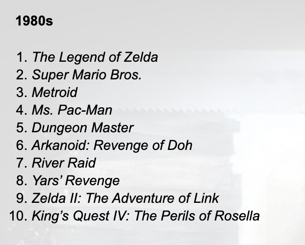 cannot fucking BELIEVE bionic commando (NES) did not make tevis thompson's list of the best games of the 1980s. what garbage. http://tevisthompson.com/videogame-lists/ …pic.twitter.com/1PPlkt2Dq4