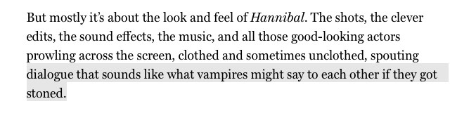 I like Hannibal because it's a show where instead of ever talking like actual human beings the characters just constantly sip wine while saying things like "Betrayal and forgiveness are best seen as something akin to falling in love."