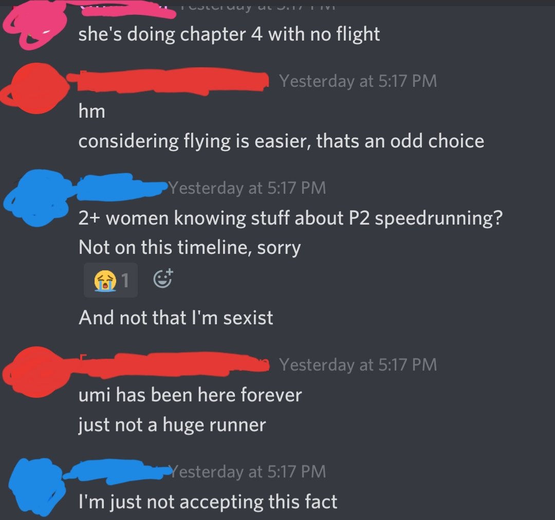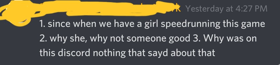 Ironically around the time my run got first announced they were talking like "its so weird women dont do speedrunning as much".. yea i wonder why