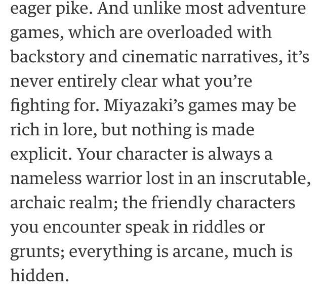 I talked about this a bit on the stream. From this interview w/ BB's director by @SimonParkin: http://www.theguardian.com/technology/2015/mar/31/bloodborne-dark-souls-creator-hidetaka-miyazaki-interview …pic.twitter.com/IED55ihmFZ