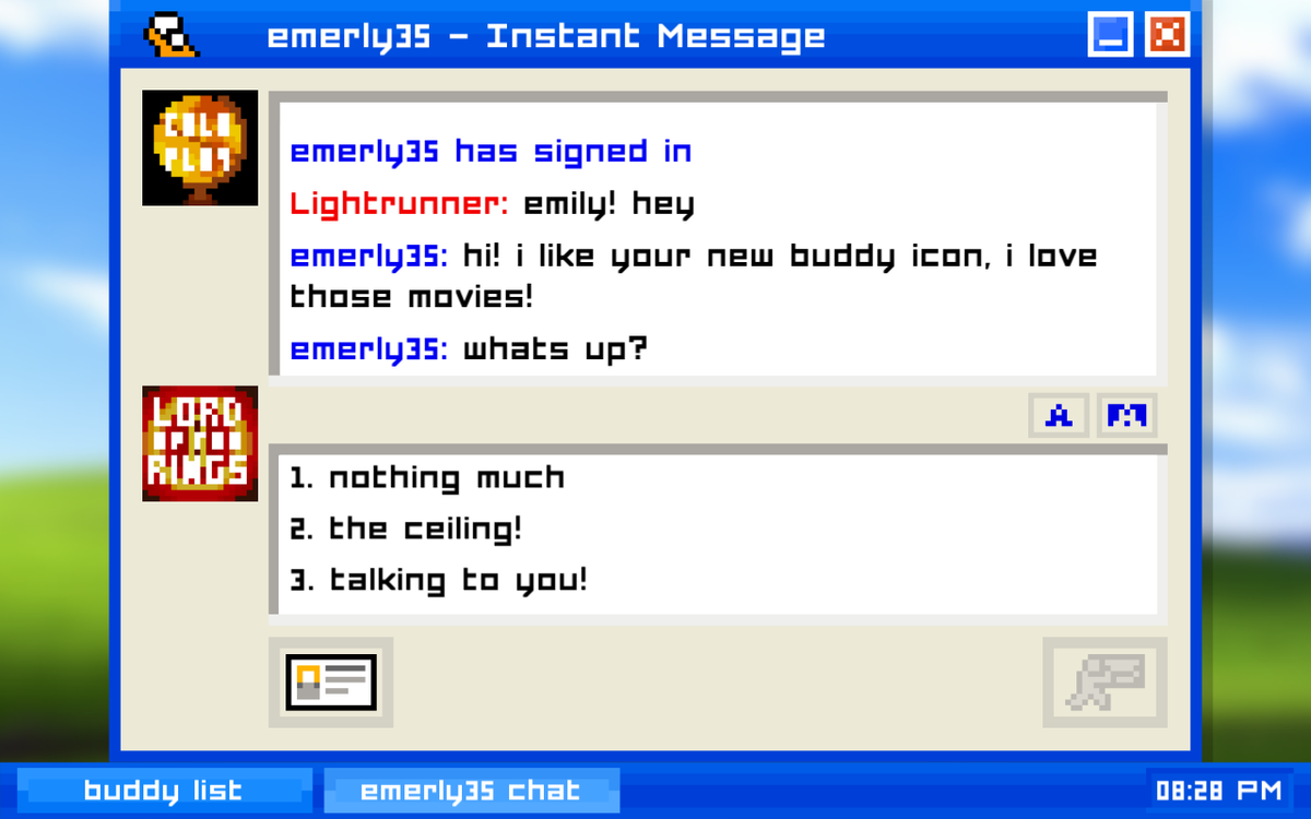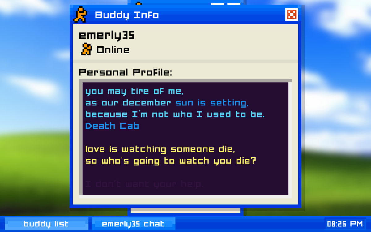 Thanks to @TomMcShea for recommending the honest, affecting Emily Is Away by @KyleSeeley23. http://kyleseeley23.itch.io/emilyisaway pic.twitter.com/BJhf9SCtIi