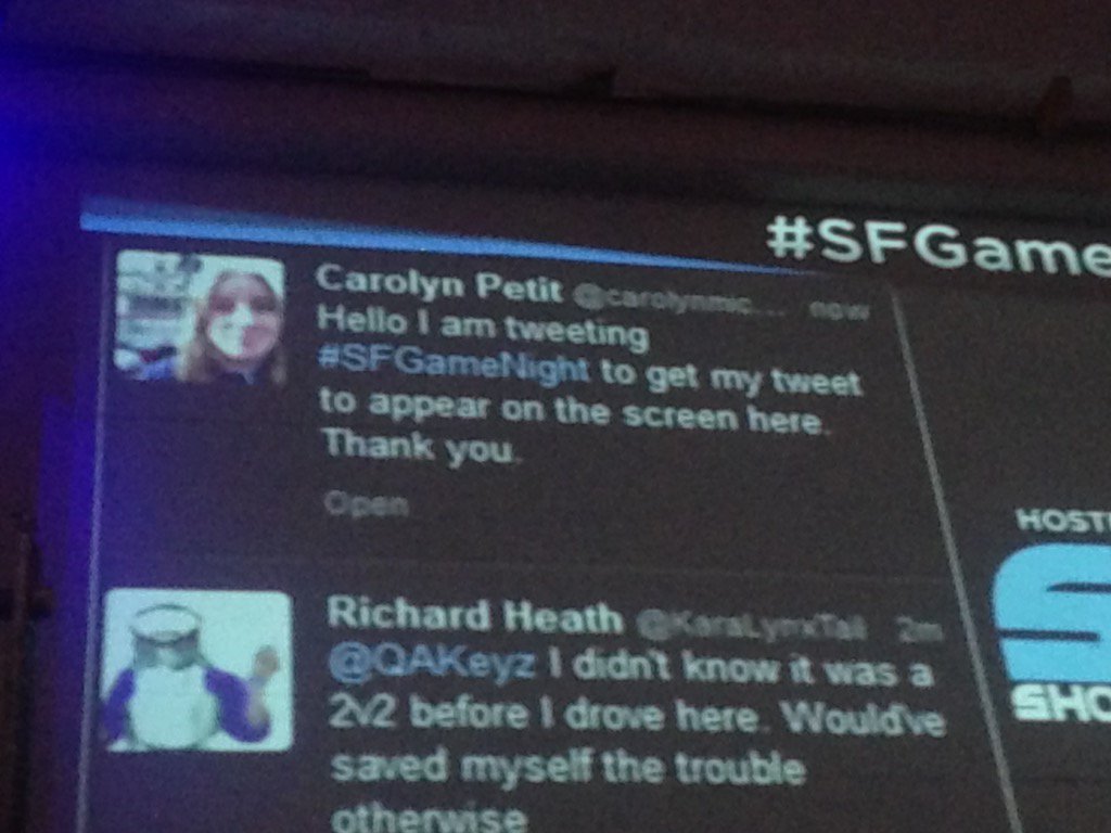 Hello I am tweeting #SFGameNight to get my tweet to appear on the screen here. Thank you.