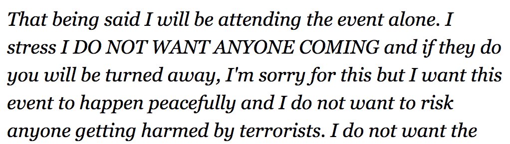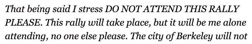 I am having a party on my birthday but I WILL HAVE IT ALONE. Here is the address to DEFINITELY NOT ATTEND at 5PM... http://abc7news.com/politics/leader-of-berkeley-rally-asks-people-to-stay-away/2342528/ …