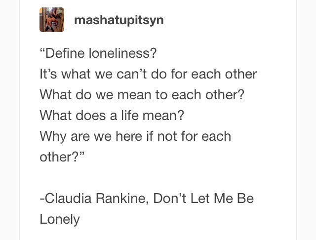 mashatupitsyn: “Define loneliness? It’s what we can’t do for each other What do we mean to each other? What... http://tmblr.co/ZwAMEy1-vZxLs