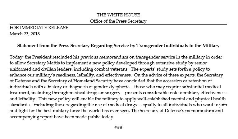 Sarah Sanders statement, at 9:22 PM Friday, says banning most trans people from service is about "military effectivess and lethality" - and equality. Argues that now the military can "apply well-established mental and physical health standards" "equally to all individuals." pic.twitter.com/2TjMBqwgqY