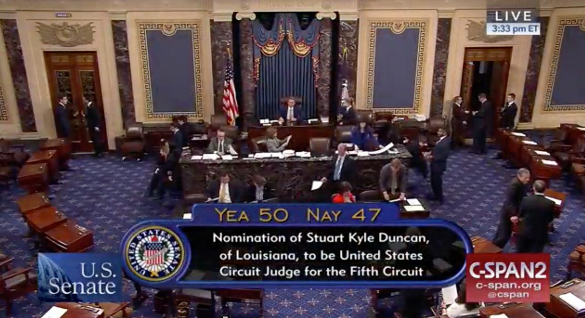 BREAKING: The Senate just confirmed Kyle Duncan, whose record clearly shows he's on the far-right fringe. Duncan has advanced an ideological agenda to diminish voting rights, LGBTQ equality, immigrant rights, and women’s reproductive freedom. Now he's on the 5th Circuit for life. pic.twitter.com/laxl0sL54z