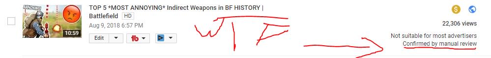 I'm sorry @TeamYouTube but this is insane... Yesterday I complained about my video being demonitized by the algorithm (which happens all the time and appealing always works for me) and now it says it got MANUALLY CONFIRMED!?!?!?! THE VIDEO IS ABOUT RANKING WEAPONS IN A VIDEOGAMEpic.twitter.com/mc8pXWdPlL