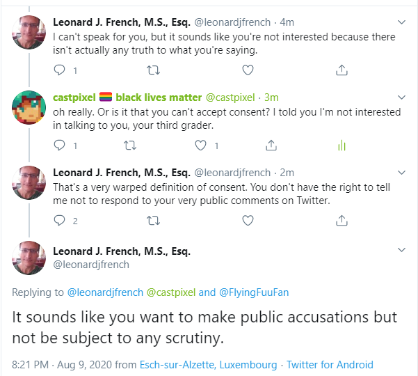 This is what happens when women come forward about abusive workplaces. Their lawyer is trying to goad me. Shitshow. https://twitter.com/leonardjfrench/status/1292511220340269056 …pic.twitter.com/A6SgE6yq0D
