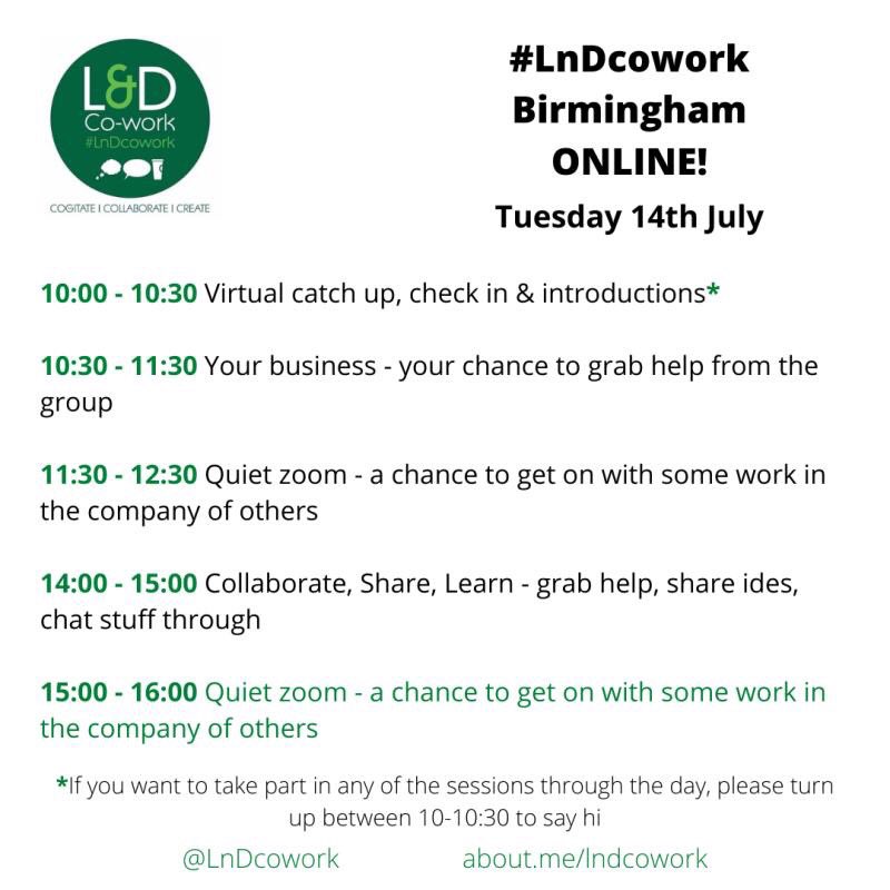 #LnDcowork Birmingham is coming again on Tuesday 14th July. Would you like to join us? If so, please book here: https://calendly.com/cat-imagineif/lndcowork … Agenda for the day is below - please come along for the hello section and then you can dip into the rest as you wish!pic.twitter.com/JxhkwsQC7K