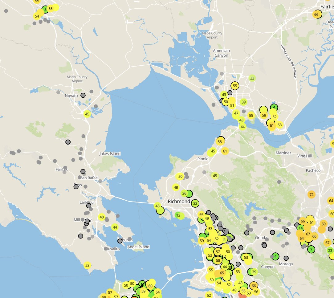 This still makes no sense to me though. #purpleair monitors in sf should be working at 8am on Sunday but EPA website (http://airnow.gov ) has SF in the red.