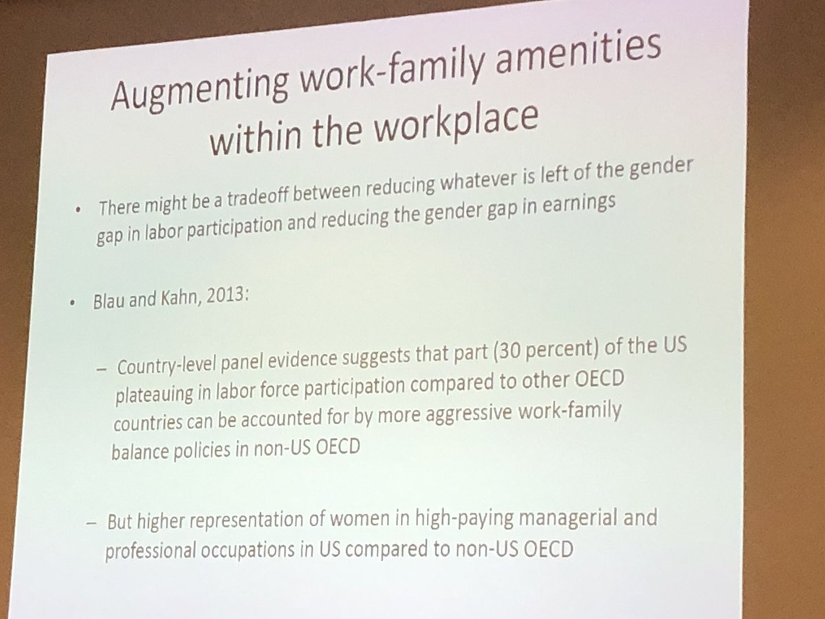 Next she reviewed the literature on work family amenities, but the story here was complex, for me, because parental time and other investments have grown for the educated. She also mentioned gender neutral childcare policies and noted these have harmed women.pic.twitter.com/QYe5mtnrpY