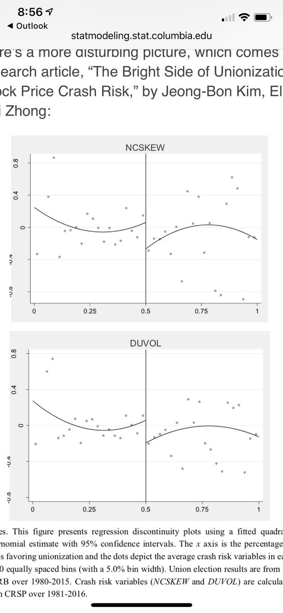 I'm not seeing a lot of discussion of their implied theoretical framework behind the RDD: the idea that union vote shares are random around majority thresholds. These are not public elections and I have significant doubts that 51% and 49% are random relative to their outcome vars