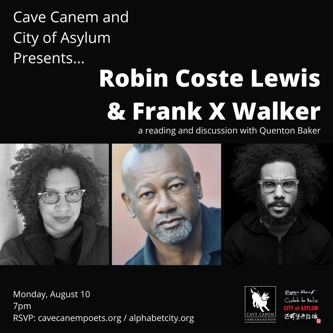 @cityofasylum are pleased to present readings by Robin Coste Lewis and Frank X Walker, followed by a moderated discussion with Cave Canem fellow@QuentonBaker! RSVP here: https://www.alphabetcity.org/events/cave-canem-presents-robin-coste-lewis-frank-x-walker/ …pic.twitter.com/nZ5x7tpqGJ