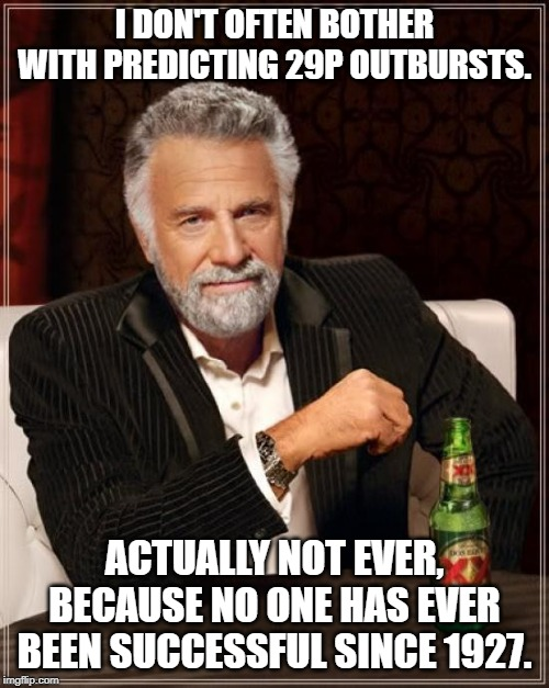 The tail on comet 384P/Kowalski almost directly away from the sun with hardly any apparent curvature toward -v. Just not your typical JFC thick dust tail. seems odd to me.pic.twitter.com/vFH8m3iOSC