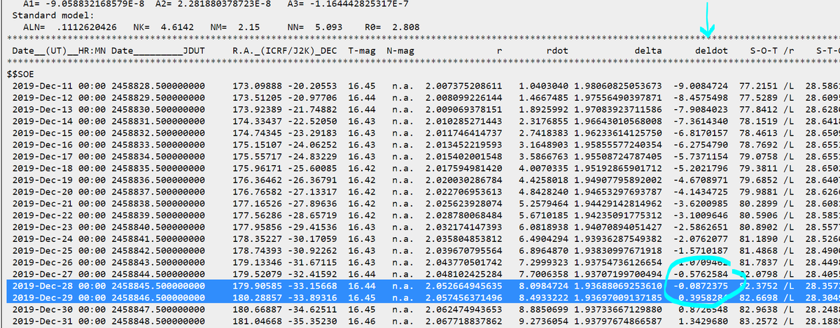 A solar system body such as 2I/Borisov passes closest to Earth when the deltdot column of a JPL Horizons ephemeris changes sign. That occurs on 2019-Dec-28 04:18 UT if you narrow the time increment down to minutes. JPL maintain orbits up to date and you can rely on it.pic.twitter.com/7nFr0UVG0K