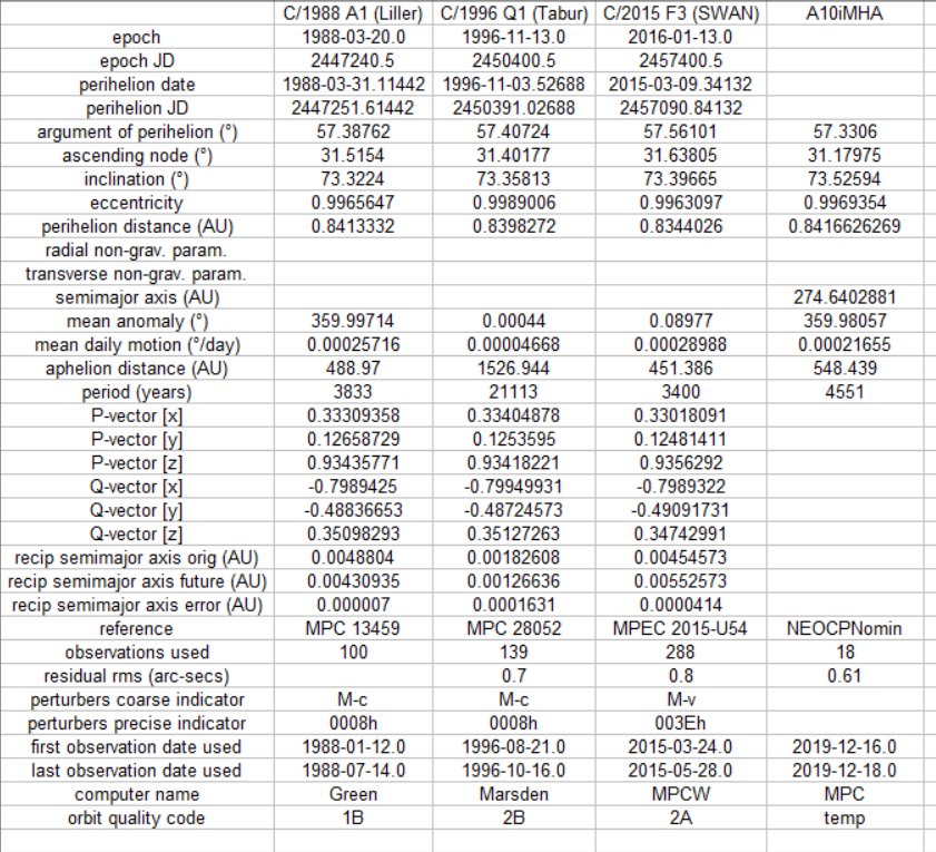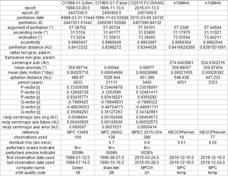 Truly remarkable. The NEOCPNomin orbit of PCCP object A10iMHA after 8 days and 77 observations continues to be very similar to the orbits of C/1988 A1 (Liller), C/1996 Q1 (Tabur), and C/2015 F3 (SWAN). amazingpic.twitter.com/3BenbgzXiE