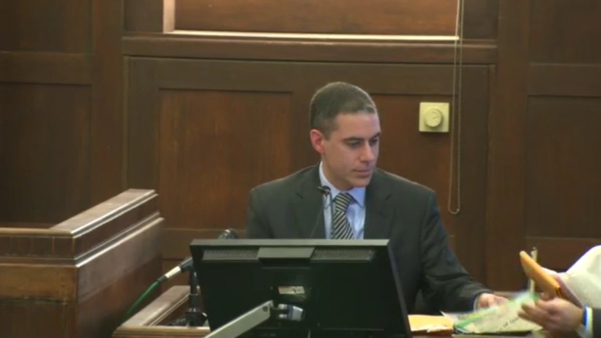 #AaronHernandez watches intently as defense attorney Baden begins questioning Murphy.#WBZpic.twitter.com/Xghcd6n8BB