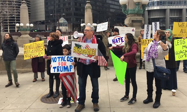 People gathered for unity across the river from the Trump Tower in Chicago, chanting "less wall, more tacos" http://cbsloc.al/2lCCLMy pic.twitter.com/smrv7cQDYz