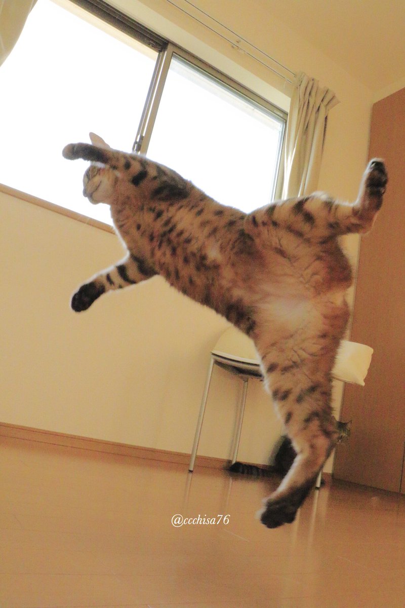 【今日のにゃんこ】 「ミルコの飛んでる瞬間撮れた!」嬉しくて主人に写真見せると「いいケツや」と一言。 そこ?!( ̄▽ ̄;) ミルコ
