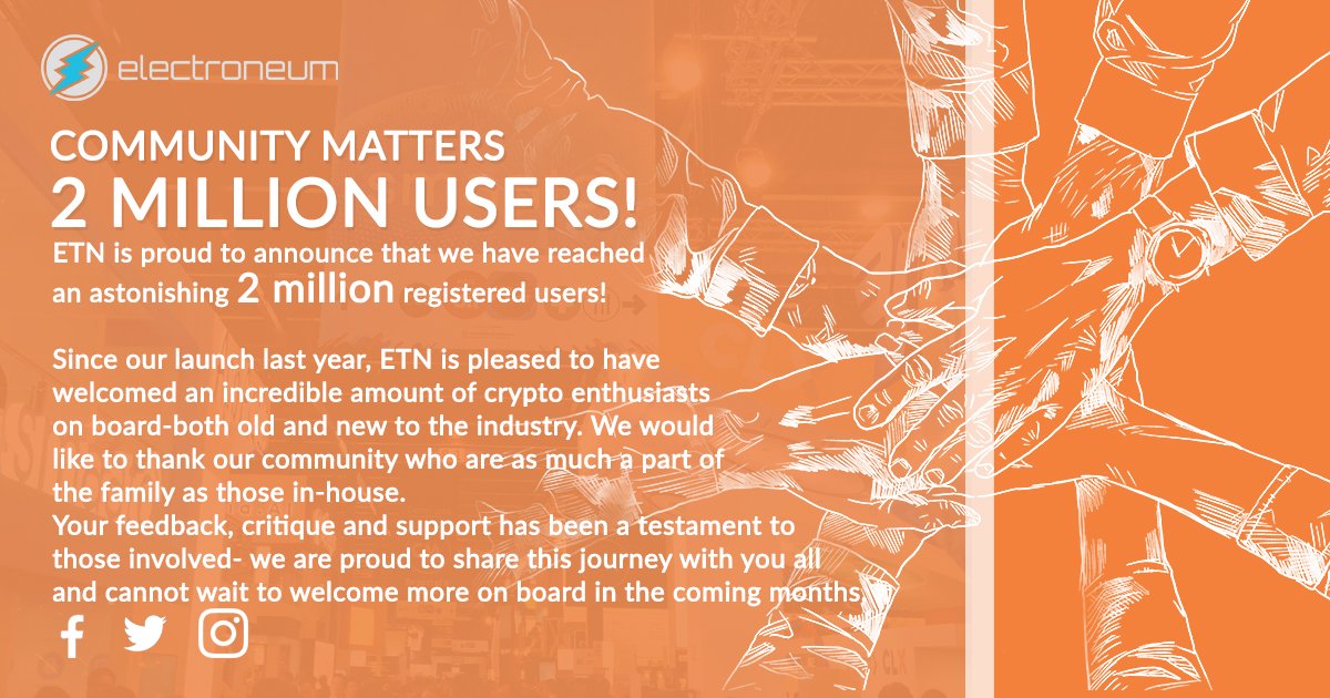 #2MILLION Users! It’s been less than a year since launch and ETN has already undergone an incredible journey! As our investors, as new-comers, miners and mobile app users; we would like to thank all of you for your belief and trust in the Electroneum vision.#ETN2mpic.twitter.com/kvNmYT2ePh