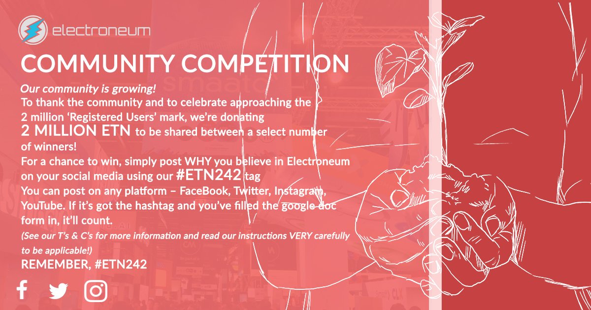 As the 2m user mark fast approaches, we're celebrating with a 2m ETN giveaway! We've got a range of prizes (including a top prize of 400k ETN!) for the best reason for believing in Electroneum. See our Facebook page to find out more: https://docs.google.com/forms/d/e/1FAIpQLSd-xP8KL59agIs1yCS58YWWXyu9tV_9mWZ1ChbU3MNB1BUi3g/formResponse …