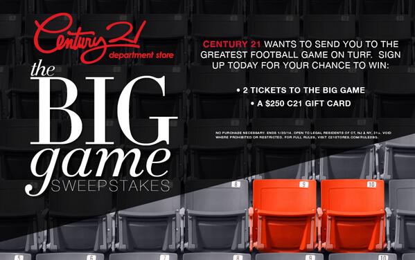 Go to the greatest game on Earth! Enter for a chance to win two tix to the Big Game: http://www.c21stores.com/biggame pic.twitter.com/3kXZgPE8Sv