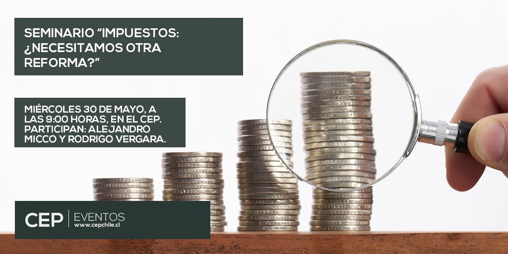 Te invitamos al seminario "Impuestos: ¿necesitamos otra reforma?". El miércoles 30 de mayo, a las 9:00 horas, en el CEP. Participan: Alejandro Micco y Rodrigo Vergara. Inscríbete aquí: https://bit.ly/2IPJ2mm pic.twitter.com/1XmweqI3uD