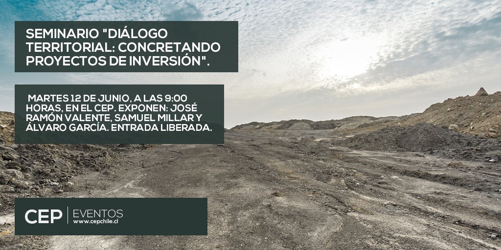 Te invitamos al seminario "Diálogo territorial: concretando proyectos de inversión". El martes 12 de junio, a las 9:00 horas, en el CEP. Exponen: José Ramón Valente, Samuel Millar y Álvaro García. Inscríbete aquí: https://bit.ly/2J58stl pic.twitter.com/SNbbWNAm9g