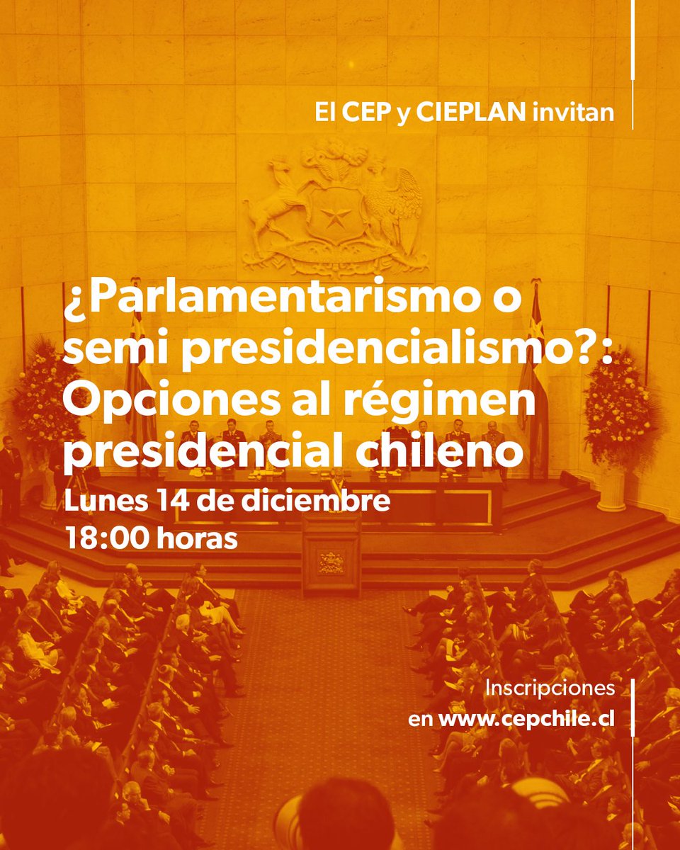 #ElCEPInvita junto a Cieplan al seminario "¿Parlamentarismo o semi presidencialismo?: Opciones al régimen presidencial chileno", el 14/12 desde las 18 hrs. Este encuentro contará con Ignacio Walker, Ana María García, y Sebastián Soto