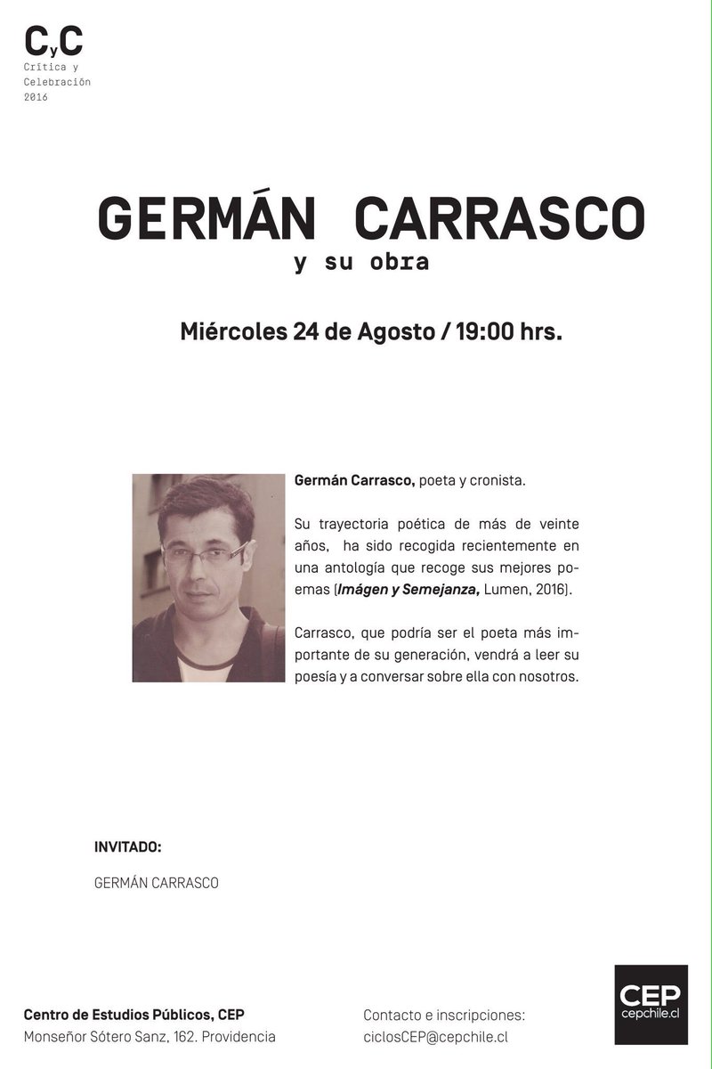 24 Ago en el CEP: "Germán Carrasco y su obra" http://bit.ly/2bIvdr2 pic.twitter.com/DbcjxqGmcI