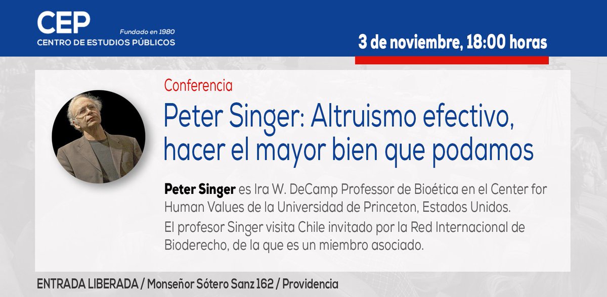 Conferencia: @PeterSinger: Altruismo efectivo, hacer el mayor bien que podamos http://bit.ly/2exCKsG Info e inscripcionespic.twitter.com/bvwL4tgWat