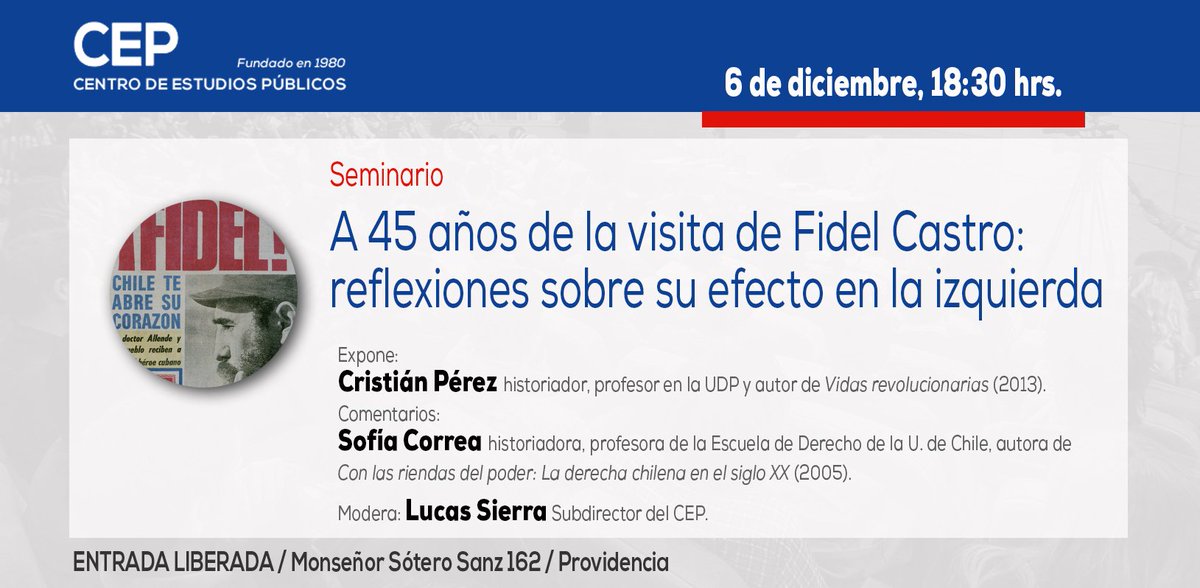 HOY 18.30h Seminario: A 45 años de la visita de #Fidel Castro: Reflexiones sobre su efecto en la izquierda chilena http://bit.ly/2gOtWAa pic.twitter.com/MnMGa6NLfq