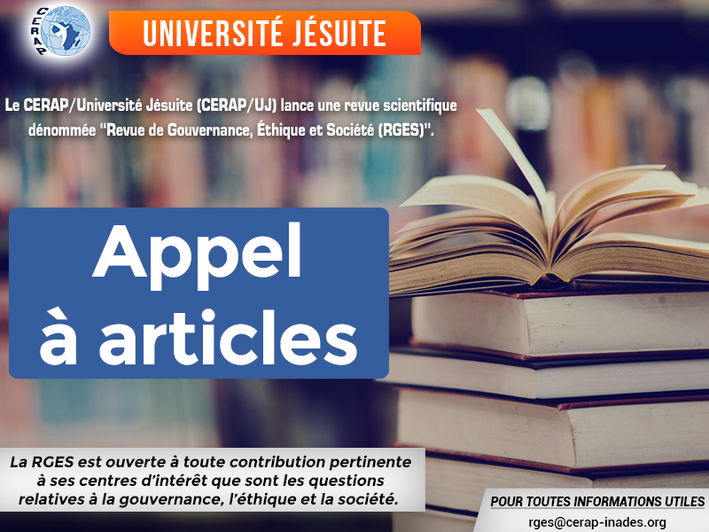 RGES - APPEL À ARTICLES Le Centre de Recherche et d’Action pour la Paix/Université Jésuite (CERAP/UJ) d’Abidjan lance une revue scientifique, "Revue de Gouvernance, Éthique et Société (RGES)".pic.twitter.com/9YWCOk2vKj