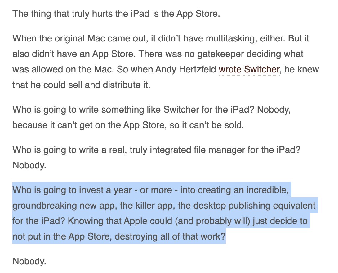 @MicroConf businesses are web apps. Why? Apple can't decide to destroy you on a whim. via.@ignorethecode http://ignorethecode.net/blog/2020/01/29/the_failure_of_the_ipad/ …pic.twitter.com/laGXALuHe8