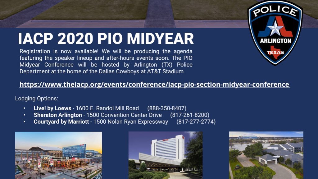 @ATTStadium for the IACP PIO Midyear conference April 20-22, 2020. We’ll be doing hands-on training, reviewing case studies, learning best practices and more. Sign up: https://www.theiacp.org/events/conference/iacp-pio-section-midyear-conference …pic.twitter.com/RtCS7dJtnK