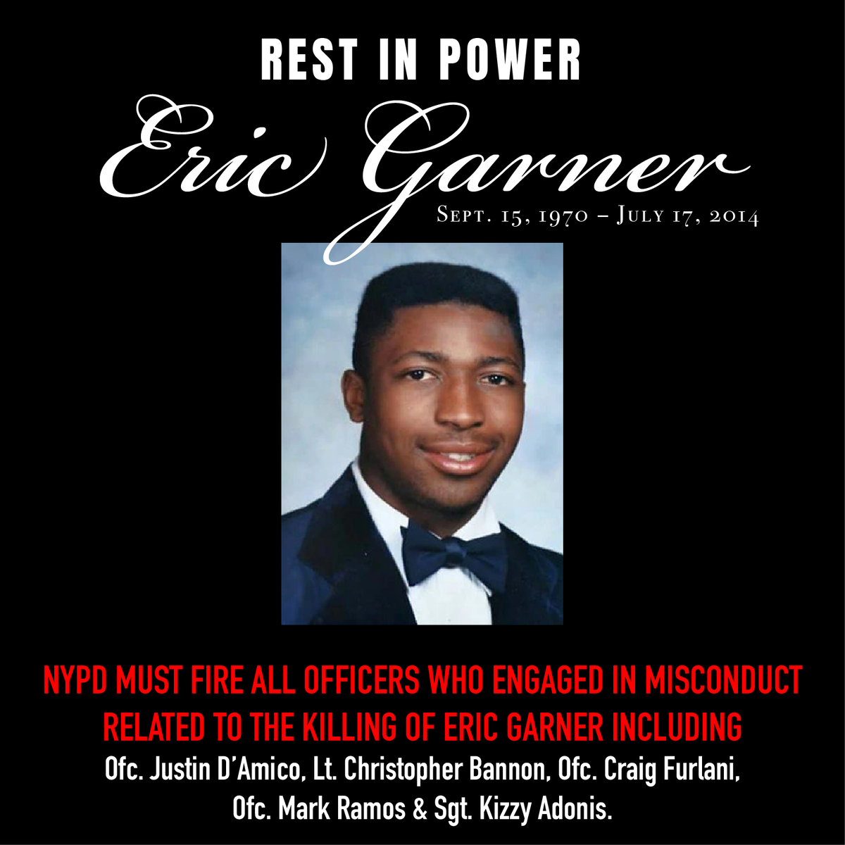 We demand NYPD bring disciplinary charges & fire officers Justin D’Amico who filed false felony charges, Mark Ramos & Craig Furlani for failure to provide aid/intervene & Lt. Christopher Bannon who texted "no big deal" that #EricGarner had no pulse. #FireNYPD #BlackLivesMatterpic.twitter.com/2tH1LpPzrE