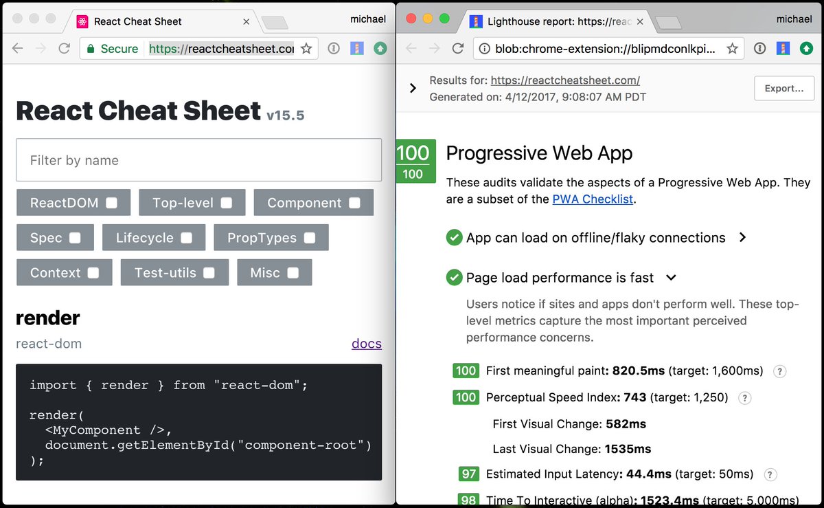 http://reactcheatsheet.com is now a Progressive Web App with a 100/100 Lighthouse score. Works offline on Chrome!pic.twitter.com/gfutIVWThQ