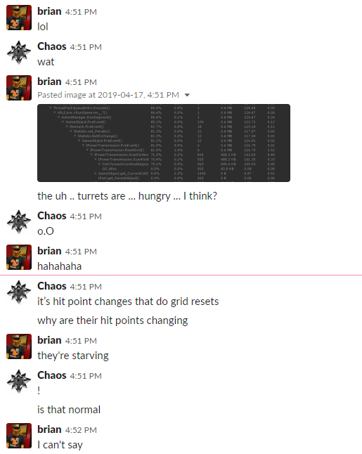 So we were having some performance problems with Grit Gate's power grid once we hooked up turrets to it. Turns out the uh ... turrets were ... hungry?pic.twitter.com/2M9VzKRx4m