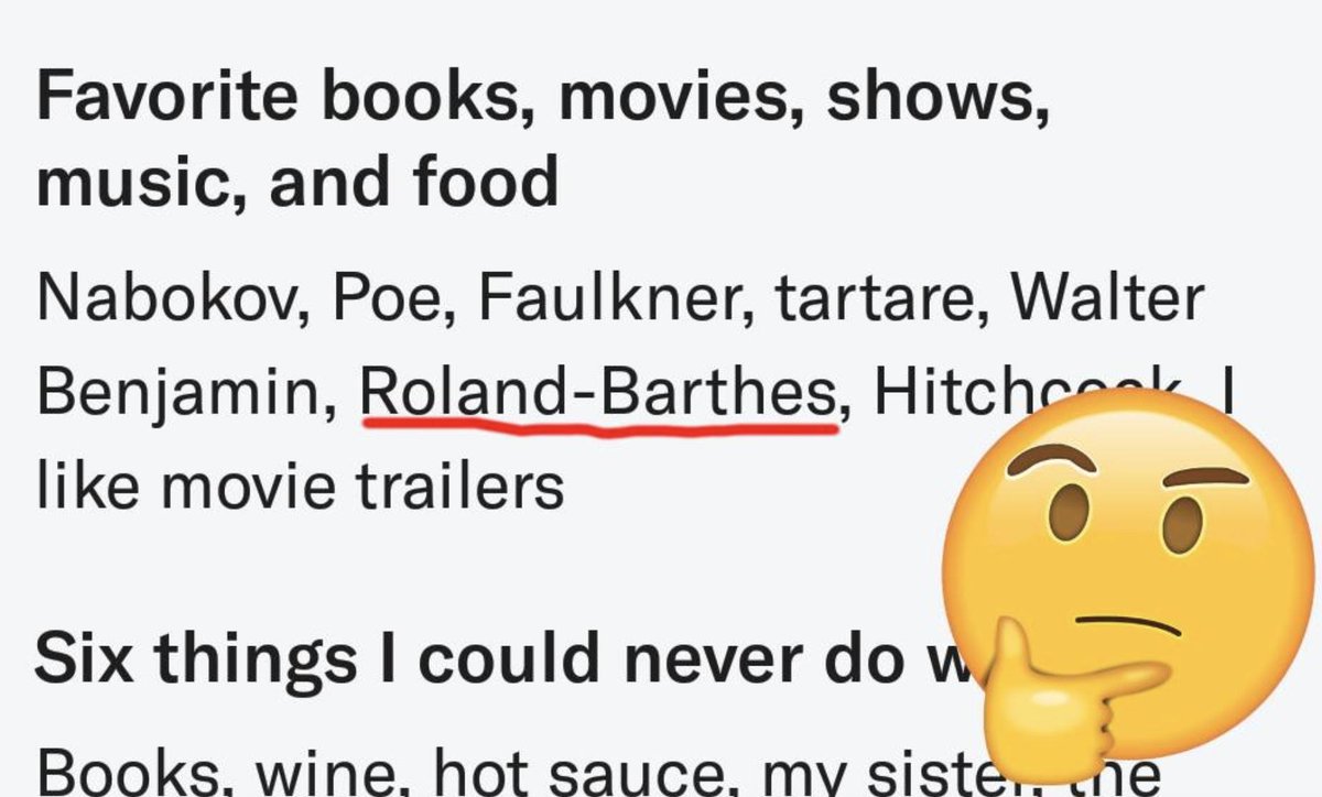 saw dating profile that said they like "Bell Hooks" it'd bad enough to be into bell hooks hard enough that you put it on a dating profile but how the fuck are you going to be that into bell hooks and write her name "Bell Hooks"