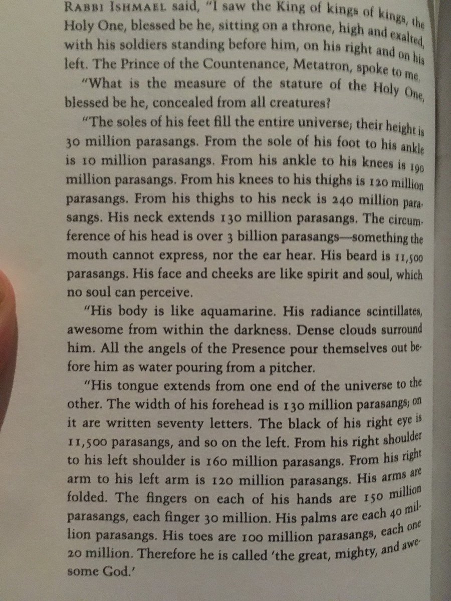 yo I’m reading a book on jewish mysticism and they just straight up gave measurements for how big god is??? one parasang is three miles, for referencepic.twitter.com/kIWYzwlBUn