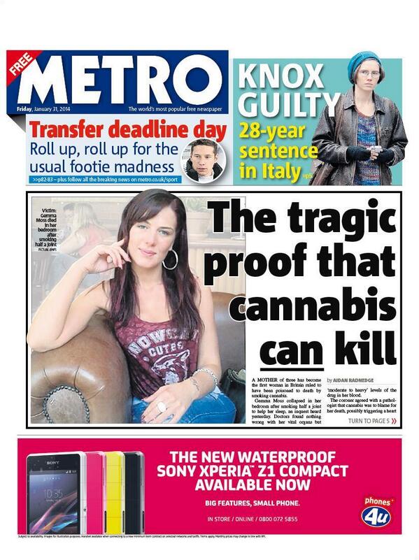 MT @BBCNews: Friday's Metro: "The tragic proof that cannabis can kill" pic.twitter.com/aOgCTqUHyQ This would literally be the 1st recorded case