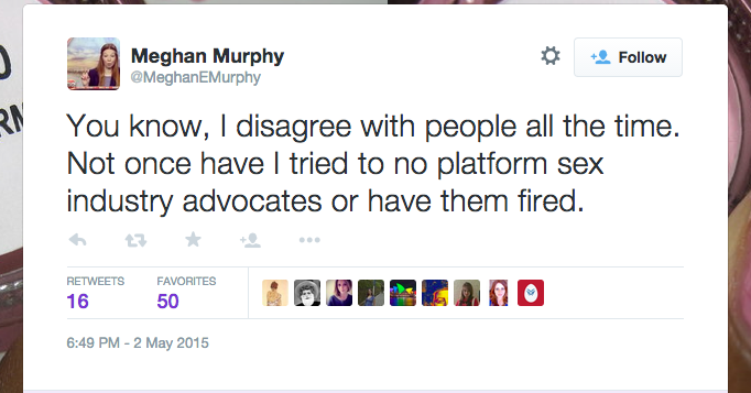 Meghan Murphy never tried to have sex industry advocates fired. Coz criminalising my clients isn't firing me. #DropMMpic.twitter.com/0dzlGUwqbG