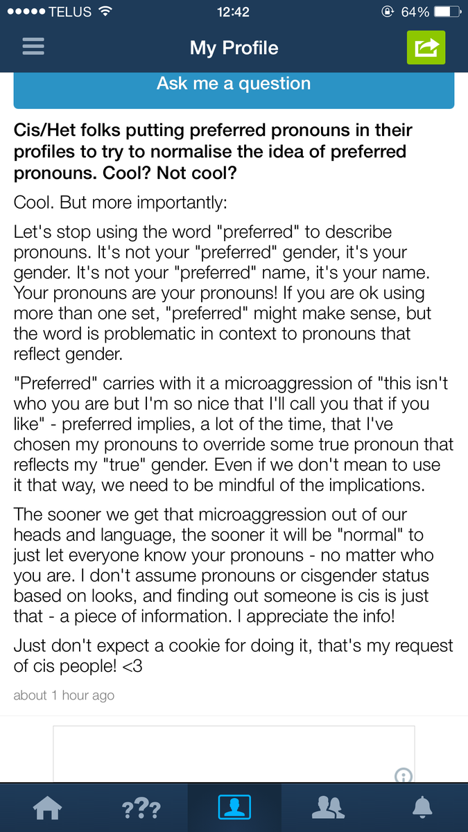 A pronoun for a person substitutes for a name. People's names are what they say they are. So are their pronouns.https://twitter.com/legobutts/status/640973757973053440 …