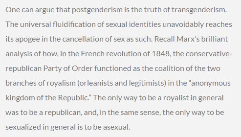 Describes support of trans people as "politically correct theory." ... and then conflates transness with gender abolitionism. The fuck.