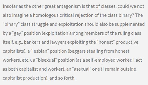 Zizek, cocaine dusting his beard like he'd just been gobbling powdered donuts: "A society in which reproduction through sex is eliminated"
