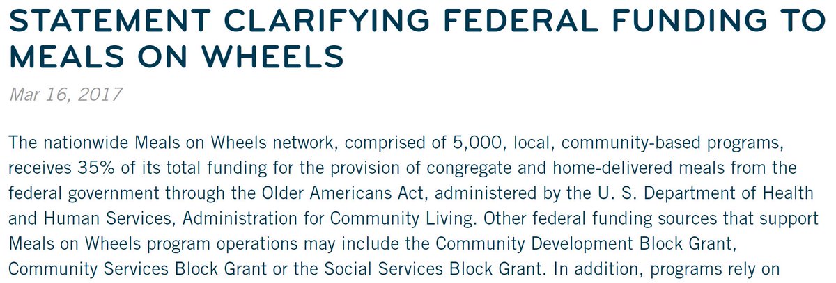8/ Trump’s proposal to cut Community Development Block Grants (CDBGs) would reduce gov’t funding for Meals on Wheels by up to 3%.