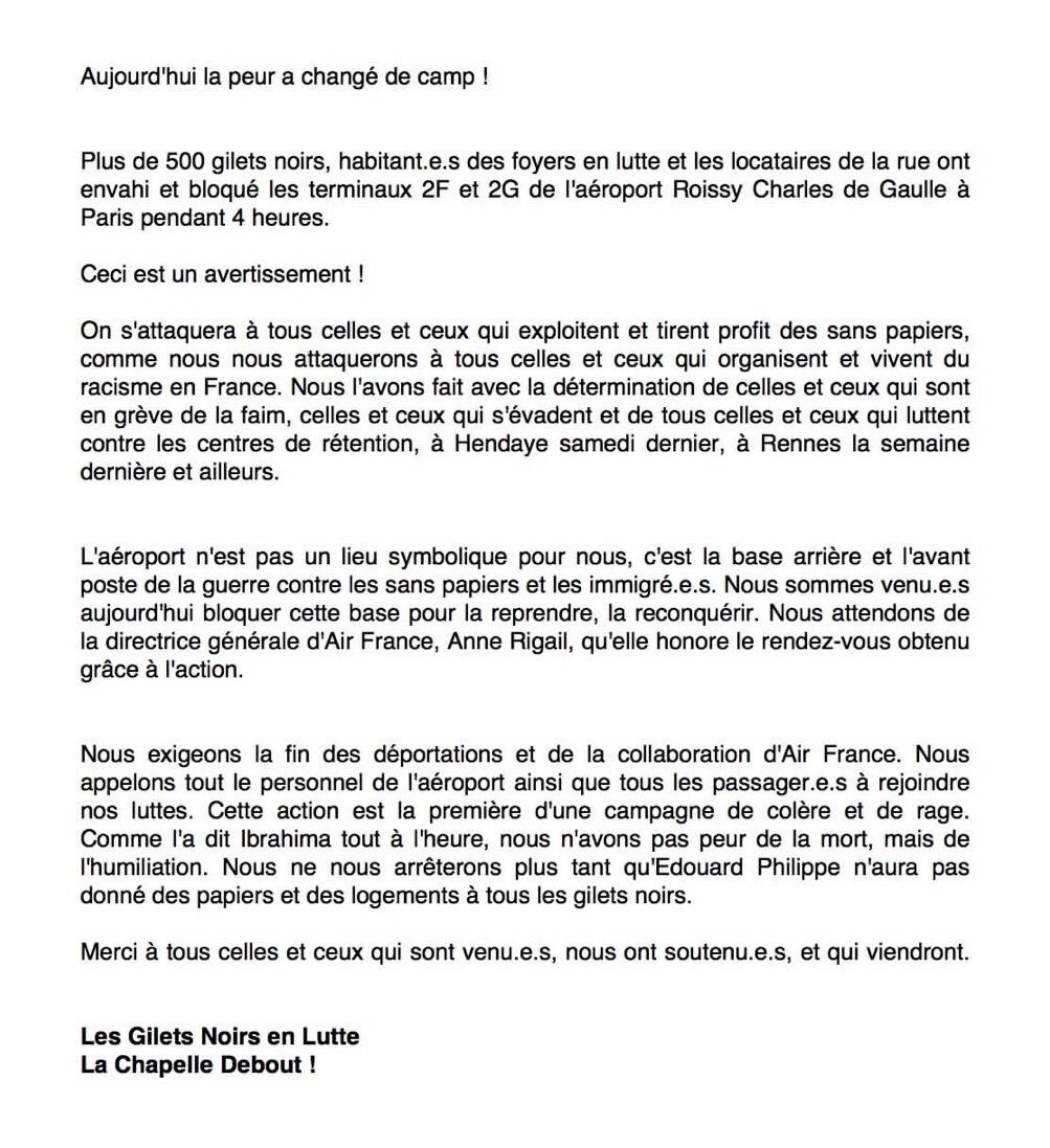 I don't have the time to fully translate it right now, but it's a communication from a group called "the black vests" (like the yellow emergency vests, but in black) that claim they have assaulted and blocked one of the airports at Paris in name of the defense for emigrants