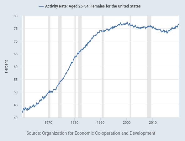 25-54 y/o women's labor force participation is basically back to where it was in 2000. US women's LFP had been declining since 2000 while it was rising in other countries. It's looking like that the puzzling decline in women's LFP was really just about labor market slack...pic.twitter.com/8rqPHDpsR1