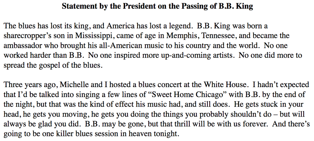 Obama recalls singing “Sweet Home Chicago” at the White House with B.B. King ->pic.twitter.com/e2FBrZeYeH