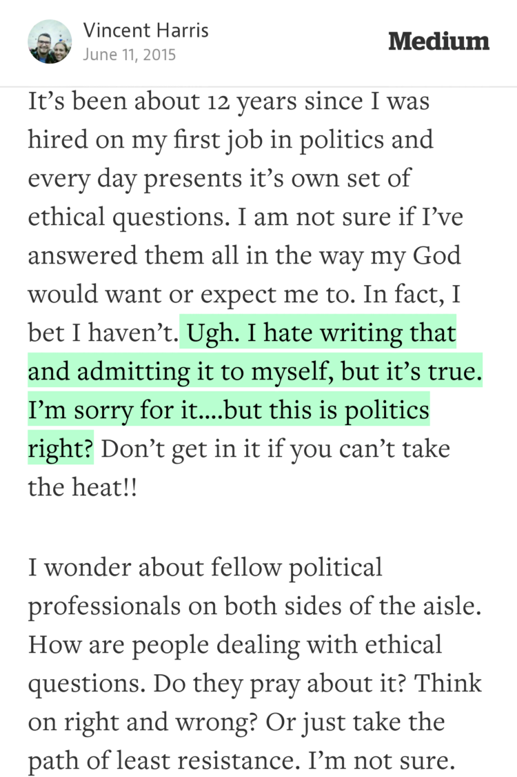 “ Ugh. I hate writing that and admitting it to myself, but it’s true. I’m…” — @VincentHarris https://medium.com/@vincentrharris/ethics-in-campaign-world-where-s-the-line-6f43a5833889?source=tw-74b9629d72a5-1434110998814#f595--share-240-354 …pic.twitter.com/UUjax0UMxn